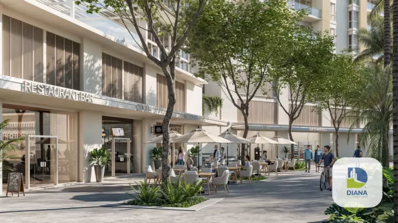Zona comercial en la planta baja de los edificios con una selección de tiendas y servicios que incluye coffee shop, fitness club, tienda de mascotas, farmacia y alquiler de bicicletas